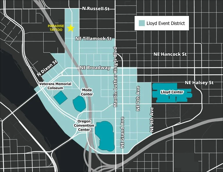 Nestled in an industrial pocket of NE Portland, Paradise Tattoo welcomes you! Street parking is available, and a nearby bus stop connects to lines 4, 24, and 44.